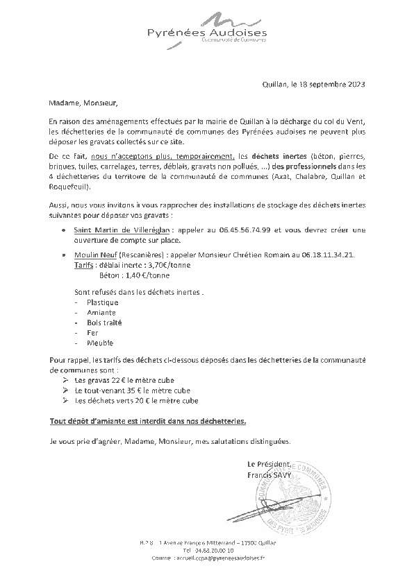 Nouveaux horaires déchetterie Chalabre